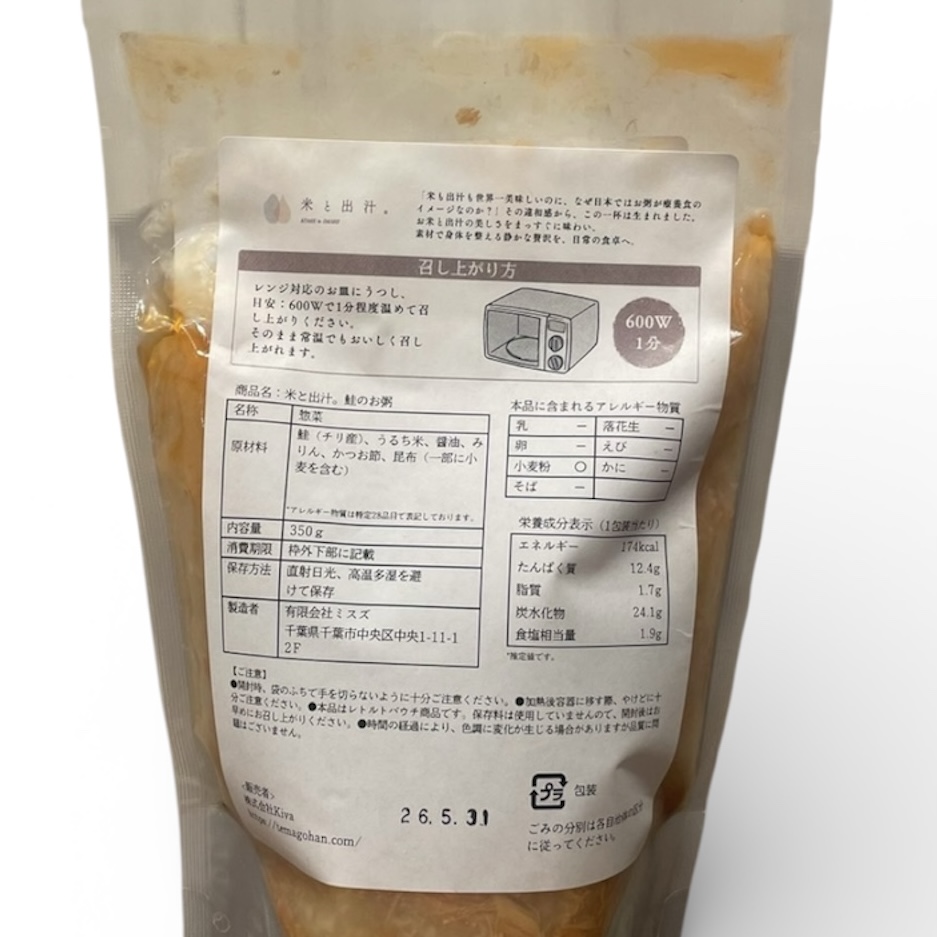 千葉県産のお米と一番出汁で炊き上げたお粥に、手ほぐしした焼き鮭を合わせました。