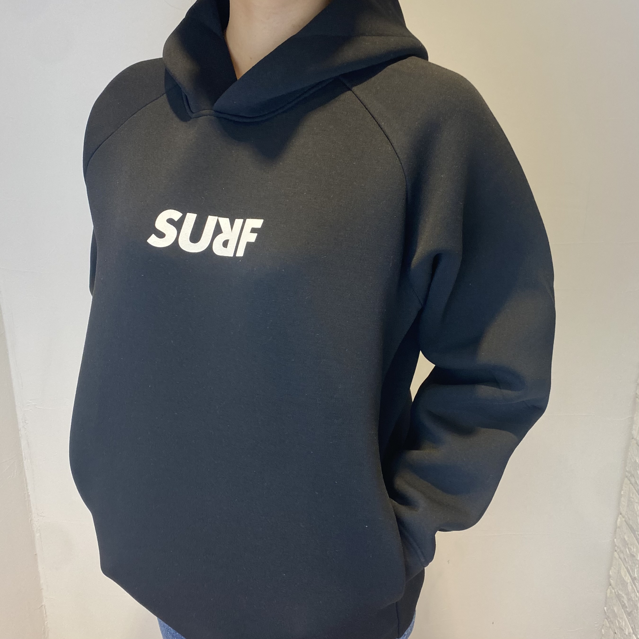 「SURF」ロゴのシンプルなデザインのパーカー。
